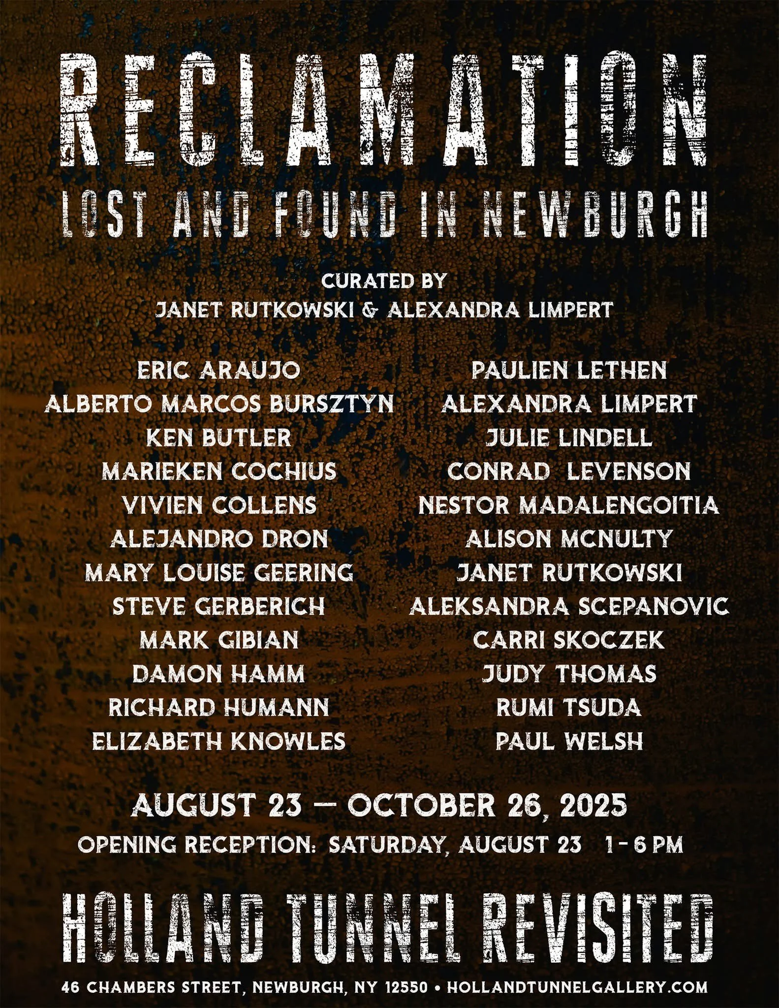 Please join us on Saturday, August 23 for the opening of Reclamation: Lost and Found in Newburgh, a group exhibition featuring artists working with found and reclaimed materials. The title also refers to the idea of reclaiming friendships between artists who have moved out of New York City to the Hudson Valley. The show will be on view in the gallery at Holland Tunnel Revisited as well as outdoors in the adjacent garden.
